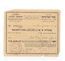 קבלה על שם החזון איש על תרומתו לישיבת אחי תמימים בתל אביב