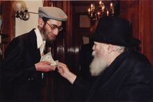 ר' אהרון קליין מקבל מהרבי דולר לצדקה