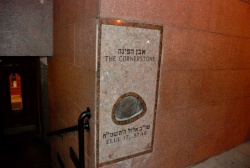 'אבן הפינה' שהניח הרבי בי"ז באלול שנת תשמ"ח. כיום מוצב בכניסה לבית הכנסת הגדול ("הזאל הגדול") ב-770 כשמסביבה לוח שיש.