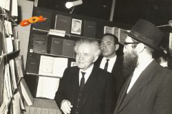 בן גוריון מבקר בדוכן חב"ד ב"שבוע הספר" מלווה ע"י הרב חנוך גליצנשטיין