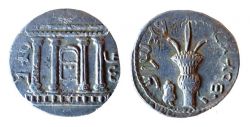 מטבע מרד בר כוכבא. בחזית: הדעות חלוקות, יש הטוענים שמדובר בבית המקדש, ויש האומרים שמדובר בשולחן הפנים