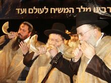 הרב שלום דובער וולפא (ימין) והרב גדליה אקסלרוד (אמצעי) לבושים שק ותוקעים בשופר, בכינוס "מי לה' אלי" בבנייני האומה בירושלים, בתקופה שלפני תוכנית ההתנתקות