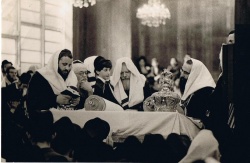 הרב שלום דובער וולף על יד הרבי (משמאל), על בימת קריאת התורה ב-770