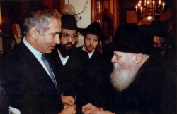 הרב דוד נחשון (במרכז) עם ראש ממשלת ישראל מר בנימין נתניהו (משמאל) אצל הרבי בחלוקת דולרים