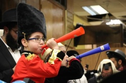 ילדים מוחים את המן בשעת קריאת המגילה ב-770