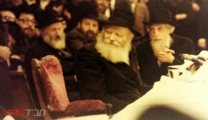 הרבי במהלך התוועדות שערך בזאל הגדול של 770, על בימת ההתוועדויות. מאחוריו נראה יושב המזכיר הרב חיים מרדכי אייזיק חודקוב