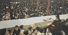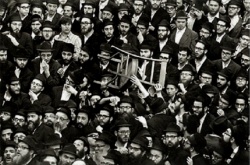 חסידים בהתוועדות של הרבי בזאל הגדול, מעבירים מעל ראשיהם כיסא (ככל הנראה עבור אחד מזקני החסידים, להם היו שמורים מקומות ישיבה מאחורי הרבי על בימת ההתוועדויות)