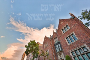 המחשה של עננים מעל 770, עליהם מופיע כיתוב של ייעוד הגאולה: "וַאֲרוּ עִם עֲנָנֵי שְׁמַיָּא"
