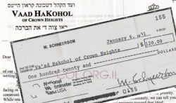 צילום הצ'ק ששלח הרבי לועד הקהל. הצילום נשלח לתושבי השכונה לעוררם לתרום להוצאות הועד