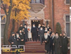 ציור המתאר את נשיאי וזקני חב"ד ליד 770