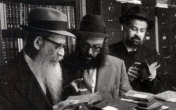 ר' ליברמן (משמאל) עם הרבנים יהודה לייב גרונר ובנימין קליין מעיינים בספרים עתיקים