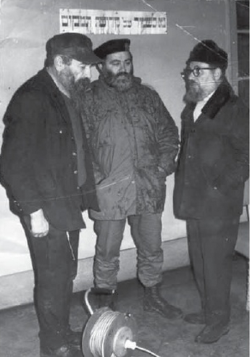 הרב ליפסקר (במרכז) לבוש במדי צה"ל בעת הדפסת התניא בפאיד מצדה המערבי של תעלת סואץ בבסיס שתחת פיקודו בעיצומה של מלחמת יום הכיפורים. מימינו: מזכירו של הרבי - הרב ניסן מינדל. משמאלו - יו"ר ועד כפר חב"ד הרב שלמה מיידנצ'יק