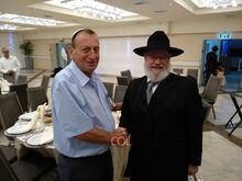 הרב גערליצקי לוחץ את ידו של ראש העיר תל אביב מר רון חולדאי (תשע"ח)