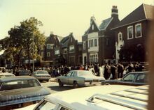שוטר עובר לפני הרבי בחלוקת לעקאח בפתח חדרו