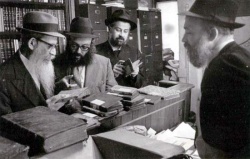 הדור הצעיר של המזכירים בעבודתם בתוך חדר המזכירות. נראים בתמונה מימין לשמאל: חיים יהודה קרינסקי, בנימין קליין, יהודה לייב גרונר ומזכירו של הרבי הריי"צ ומנהל ספרייתו - ר' חיים ליברמן