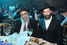 הרב מיכאל דור (מימין) כשלצידו הרב מנחם מענדל גלוכובסקי במעמד סיום ספר התורה לעילוי נשמת בנו (תשפ"ד)
