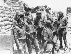 מפקדי צה"ל במלחמה בסיור במוצבים: חיים בר לב (רמטכ"ל), אריאל שרון (אלוף פיקוד דרום), דוד אלעזר (ראש אגף המבצעים - אג"ם) ומשה דיין (שר הבטחון)