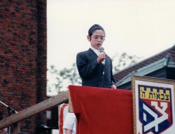 מכריז פסוק במהלך תהלוכת ל"ג בעומר תש"נ ליד הרבי
