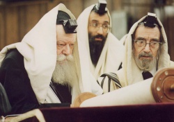 הרב מרדכי שוסטרמן נראה מימין בעת קריאת התורה בעליה של הרבי
