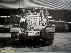תמונה של חסידים על טנק צה"ל המעוטר בשלטים אודות מבצעי המצוות של הרבי, שצולמה בשנת תשל"ג בהוראת הרבי, והרבי הוסיף בצידה האחורי ברוך השם ולאחר מכן נתלתה בקיר משרד מזכירות הרבי (בתמונה: הרב דוד קרץ (שני מימין) ופעילי חב"ד נוספים מעפולה)