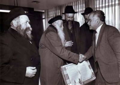 חסידי חב"ד חברי הועד למען שלימות העם מגישים לראש הממשלה יצחק שמיר את "עצומת המליון" לתיקון חוק מיהו יהודי.