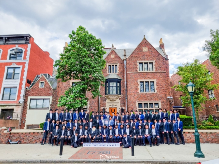 חלק מתלמידי הישיבה בתמונה קבוצתית על רקע 770 (תשפ"ג)