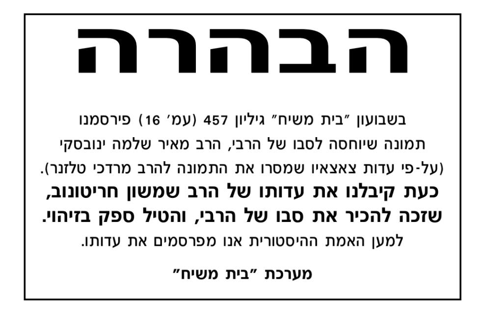 הבהרה בעיתון בית משיח על פי עדות הרב שמשון חריטנוב, שהתמונה לא נכונה.