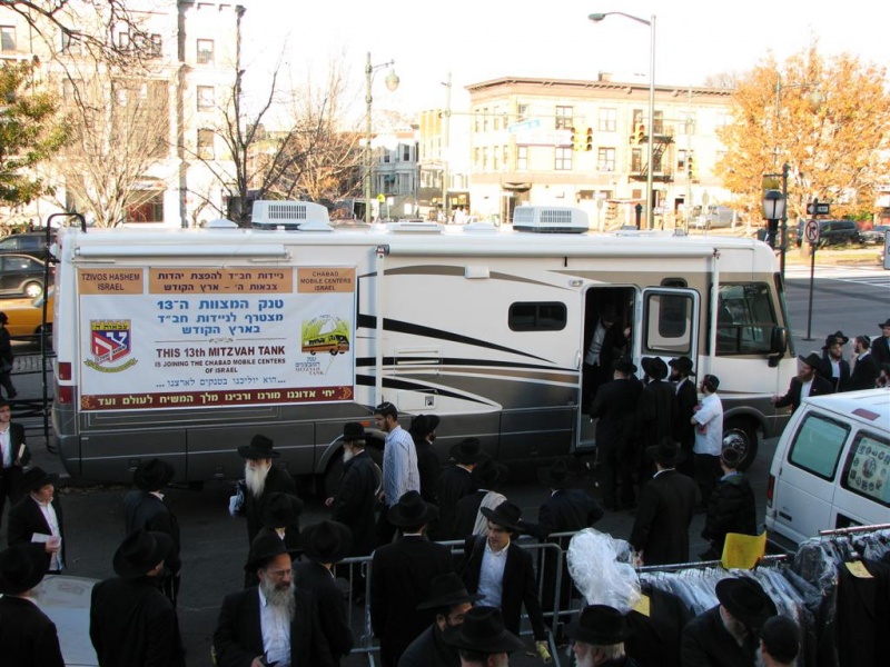 טנק מספר 13 של ניידות חב"ד באה"ק חונה ליד 770 בדרכו לאה"ק