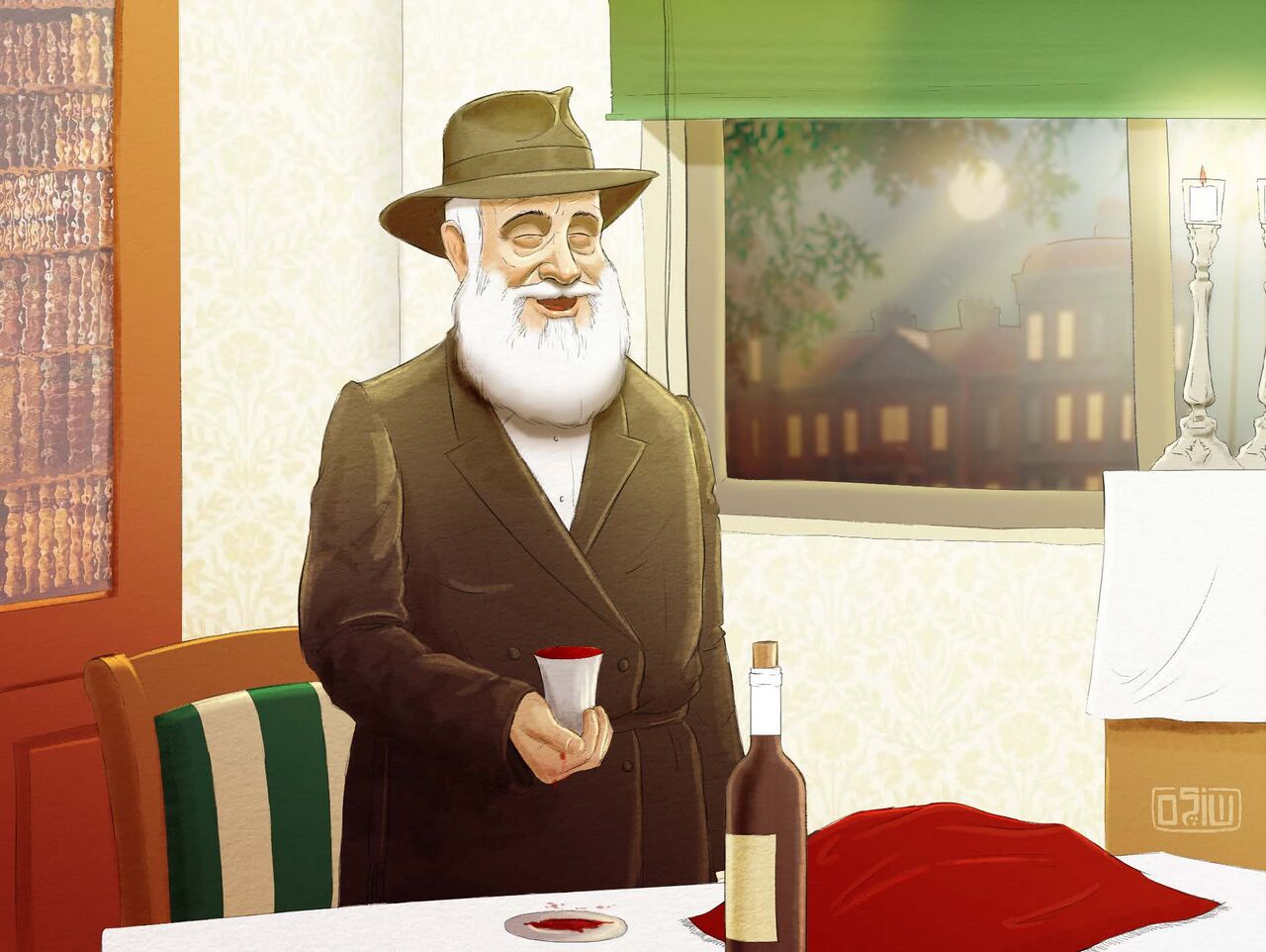 קידוש של ליל שבת. איור שולם פייגין, מתוך העלון טעם החיים גיליון ה' כ"ט אדר א' תשפ"ד