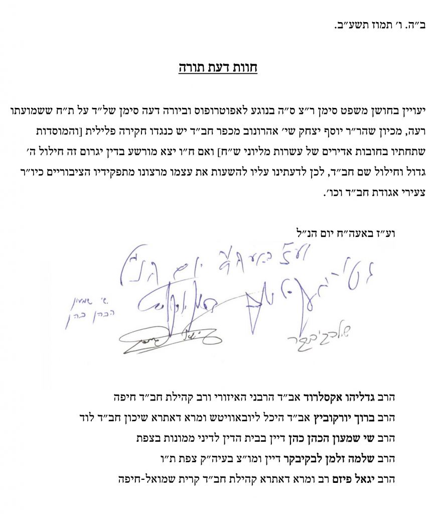 מכתב מורי צדק ורבני קהילות חב"ד בעניין אהרונוב