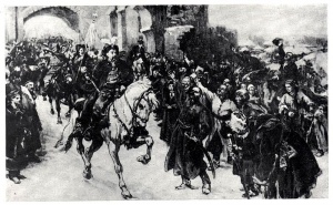 ציור המתאר את כניסת הפורעים לעיר בפרעות ת"ח-ת"ט, כאשר בראשם רוכב מנהיג המרד, בוגדן חמעלינצקי ימח שמו