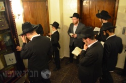 תמימים אומרים קריאת שמע שעל המיטה בסמוך לחדרו הקדוש של הרבי ב-770