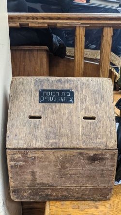 קופת צדקה במרכז בית הכנסת הגדול ב-770 של קרן עניים.