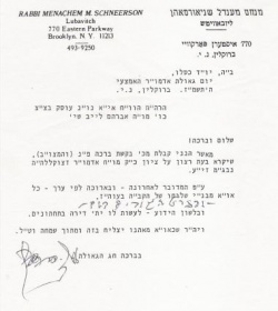 מכתבו של הרבי לשליח הרב אברהם לייב שוחט מונצואלה. על המילים "שכל אחד ואחד מבני ישראל שלוחו של הקב"ה בעולם הזה", הוסיף הרבי בכתב יד קדשו: "- ובפרט הנקובים בשם -"