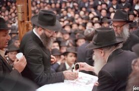 הרב שפירא מקבל כוס של ברכה מהרבי - מוצאי שמח"ת תש"נ.