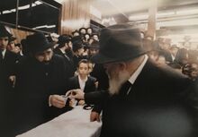 הרב וישצקי עובר לפני הרבי במעמד חלוקת כוס של ברכה