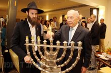 פרזידנט מדינת ישראל התשיעי מר שמעון פרס, כפרזידנט של מדינת ישראל, מדליק חנוכיה בלשכתו שבירושלים ביחד עם משלחת חב"ד - טבת, תשע"ג
