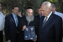הרב יעקב גלויברמן מעניק את הספר 'נשיא וחסיד' למר שמעון פרס נשיא מדינת ישראל ה-9. משמאל ראש הסוכנות לשעבר ונשיא מדינת ישראל ה-11 יצחק הרצוג