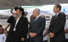 פרזידנט מדינת ישראל שמעון פרס מאזין לתקיעת שופר במעמד פתיחת שנת הלימודים בבית ספר חב"ד עיר גנים בירושלים. מימין לשמאל: ראש עיריית ירושלים לשעבר ניר ברקת, פרזידנט מדינת ישראל שמעון פרס, והרב חיים ניסלביץ'