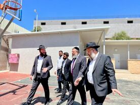 הרב ליפסקר (קיצוני משמאל) מלווה את שר הדתות ר' יואב בן צור בביקורו במוסדות חנוך לנער, יחד עם ראש הישיבה הרב חיים אליעזר וילשנסקי (תשפ"ג)