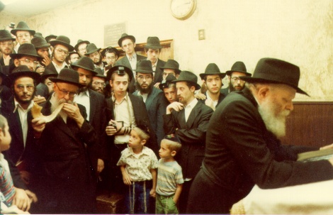 | הרבי מאזין לתקיעת שופר בחודש אלול, בזאל הקטן של 770 העמוס בחסידים שהגיעו לרבי על מנת לחגוג עמו את חגי חודש תשרי. התוקע הוא הרב יעקב יוסף רסקין. |