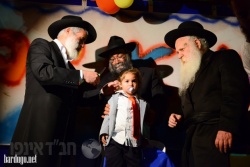 הרב מרדכי שמואל אשכנזי גוזז את שערו של אחד מילדי כפר חב"ד במעמד ההדלקה המרכזית (תשע"ד)