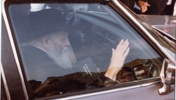הרבי בפתח סוכתו עם ספר הרמב"ם במהדורת "רמב"ם לעם" בידו