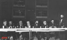 מעמד הנחת אבן הפינה לבניית בית הכנסת חב"ד בנחלת הר חב"ד. מימין לשמאל: ר' זושא וילימובסקי, ר' אפרים וולף, הרב זלצמן, ר' פייביש וואגעל, ר' משה יפה מנכ"ל היכל שלמה, הרב יהודה קולאשער (בוטראשווילי), ר' בן ציון שם טוב, ר' בערל ריקמן