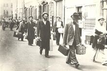 הרב אברהם צבי (במרכז) מגיע יחד עם חבריו לישיבה לעיר קוֹבֶּה שביפן עם פרוץ מלחמת העולם השנייה