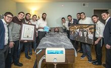 תמימים מישיבת חב"ד בלוס אנג'לס מציגים בפני הרב איצי (במרכז) תמונה שלו המורכבת מאלפי תמונות זעירות של יהודים שהניחו תפילין לזכותו, (תשע"ח)