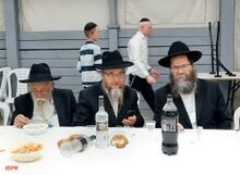 הרב אייזנבך (במרכז) בהתוועדות חגיגית שנערכה לציון יובל ה-60 להולדתו, וסיום ה-ש"ס שלו. לצידו מימין הרב מאיר אשכנזי רבה של כפר חב"ד, ולשמאלו הרב ישראל שמעון בקרמן (תשפ"ב)