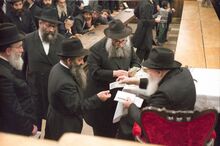 הרב מיכאלשווילי עובר לפני הרבי בחלוקת דולרים בסיום יחידות כללית