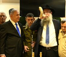 מר בנימין נתניהו מאזין לתקיעת שופר על ידי הרב מנחם מענדל בליניצקי