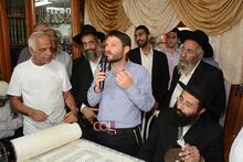 סמוטריץ' נואם בהכנסת ספר תורה לבית חב"ד ביישוב חשמונאים, על יד השליח הרב ברק כוכבי (משמאל)